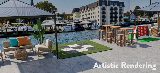 IKEA College Park is outfitting the space with lounge chairs, tables, gazebos, and lawn games. The Deck and Fence Depot is providing the perimeter fencing, putting their residential craftsmanship on full display. The effect is something like your best friend’s back deck, except it floats and has better furniture.